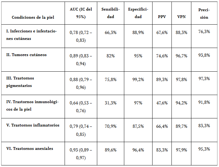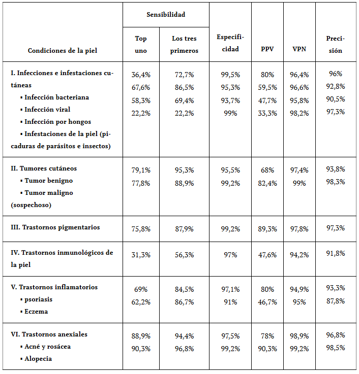 Para los trastornos pigmentarios, la sensibilidad es del 75,8% en el primero, aumentando al 87,9% en los tres primeros, con una especificidad del 99,2% y una precisión total del 97,3%. Los trastornos inmunológicos de la piel tienen una sensibilidad del 31,3% en la predicción principal, aumentando al 56,3% en las tres principales, con una especificidad del 97% y una precisión general del 91,8%. La sensibilidad a la psoriasis mejora del 69% en el primero al 84,5% en los tres primeros, con una especificidad del 97,1% y una precisión del 93,3%.