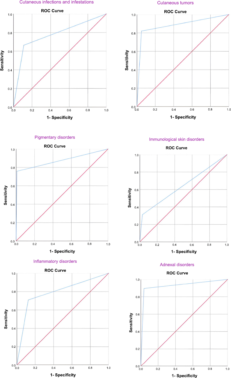 Fig. (1). Curvas ROC para software de inteligencia artificial para el diagnóstico de las principales categorías de afecciones de la piel en el grupo de estudio.