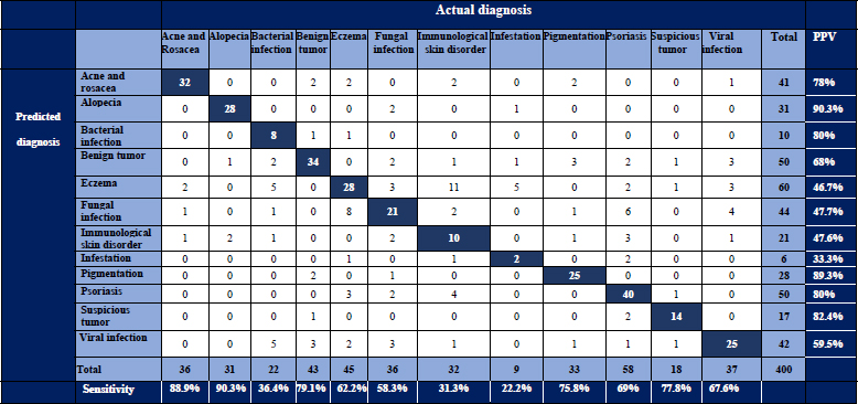 Tabla 1. Sensibilidad, especificidad, valor predictivo positivo, valor predictivo negativo y precisión total del software de inteligencia artificial para el diagnóstico de diversas dermatosis en el grupo de estudio (N=400).